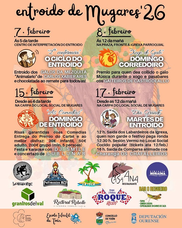O Entroido de Mugares 2026 arrincará o venres 7 de febreiro. Será ás 17:00 horas, no Centro de Interpretación do Entroido, coa 2ª conferencia do Ciclo do Entroido. A xornada estará dedicada ao Entroido dos “Animalario” de Galos da Mezquita, a cargo de Carlos Xabier Ares. O acto rematará cunha chocolatada popular aberta a todas as persoas asistentes.