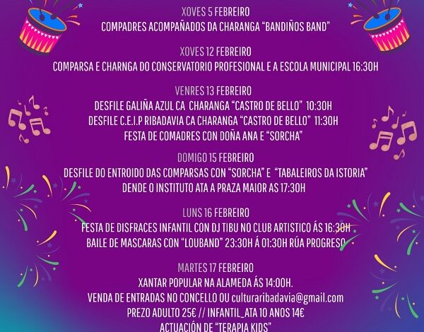 O Entroido de Ribadavia 2026 celebrarase do 5 ao 21 de febreiro cun programa cheo de desfiles, música, festas populares…
