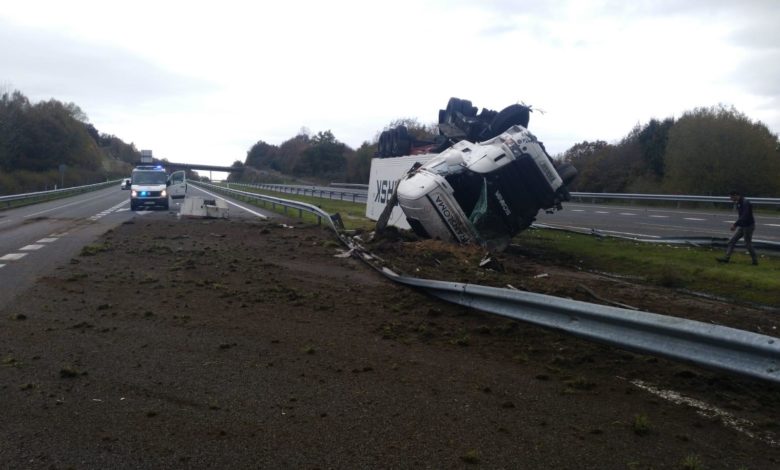 Un camión vuelca en Trasmiras cuando circulaba por la autovía A-52. El accidente provocó importantes daños materiales debido al tamaño…